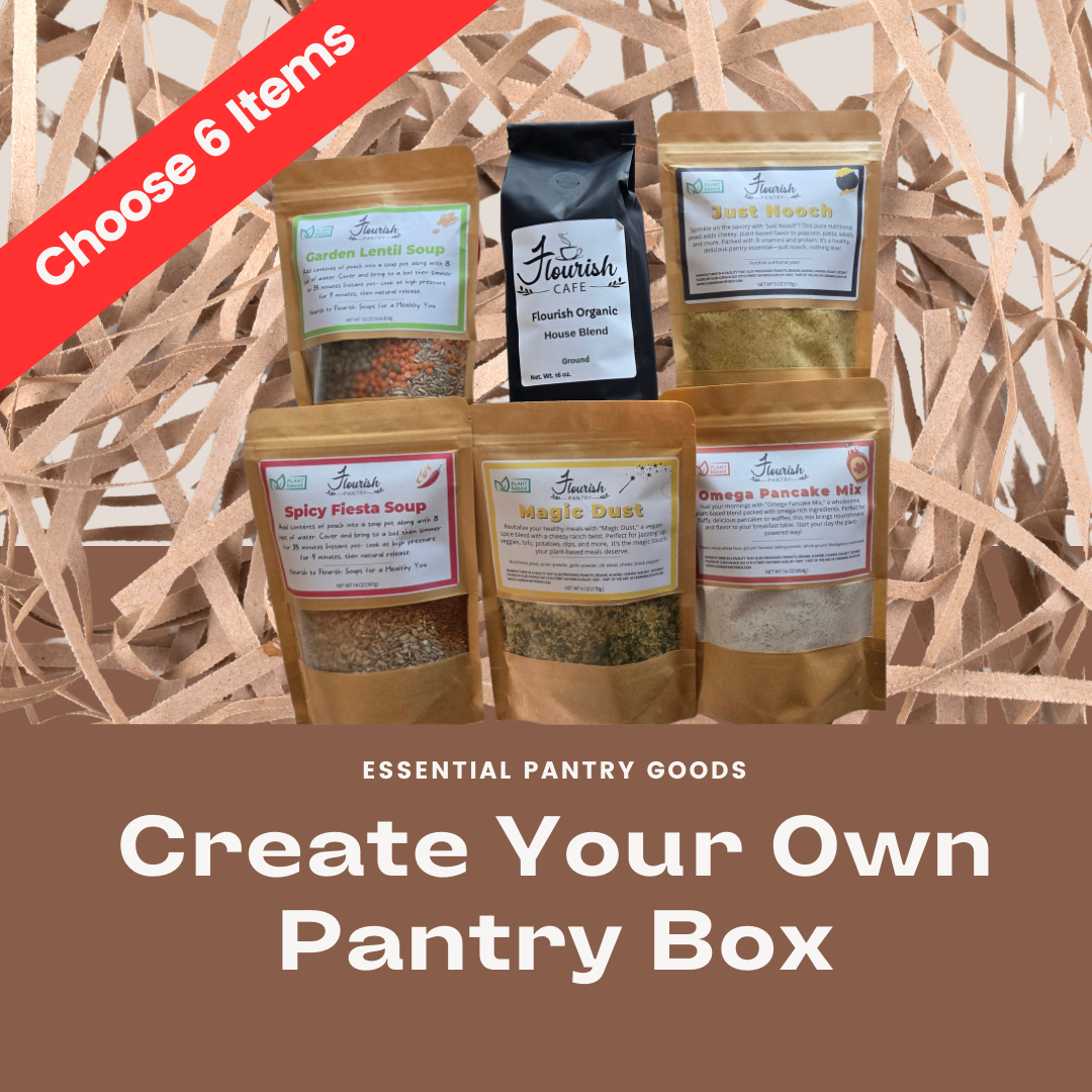 Your box, your way! With the Flourish Build-Your-Own Box, you can mix and match your favorite items to create a custom collection that suits your lifestyle. Choose from our delicious soups, organic coffee, Just Nooch, Magic Dust, Pancake Mix, or whatever else you'd like.