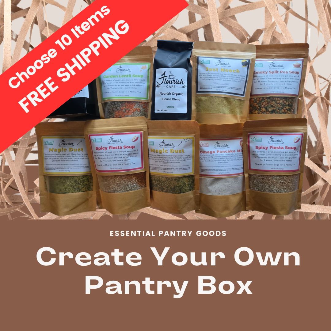 Your box, your way! With the Flourish Build-Your-Own Box, you can mix and match your favorite items to create a custom collection that suits your lifestyle. Choose from our delicious soups, organic coffee, Just Nooch, Magic Dust, Pancake Mix, or whatever else you'd like.